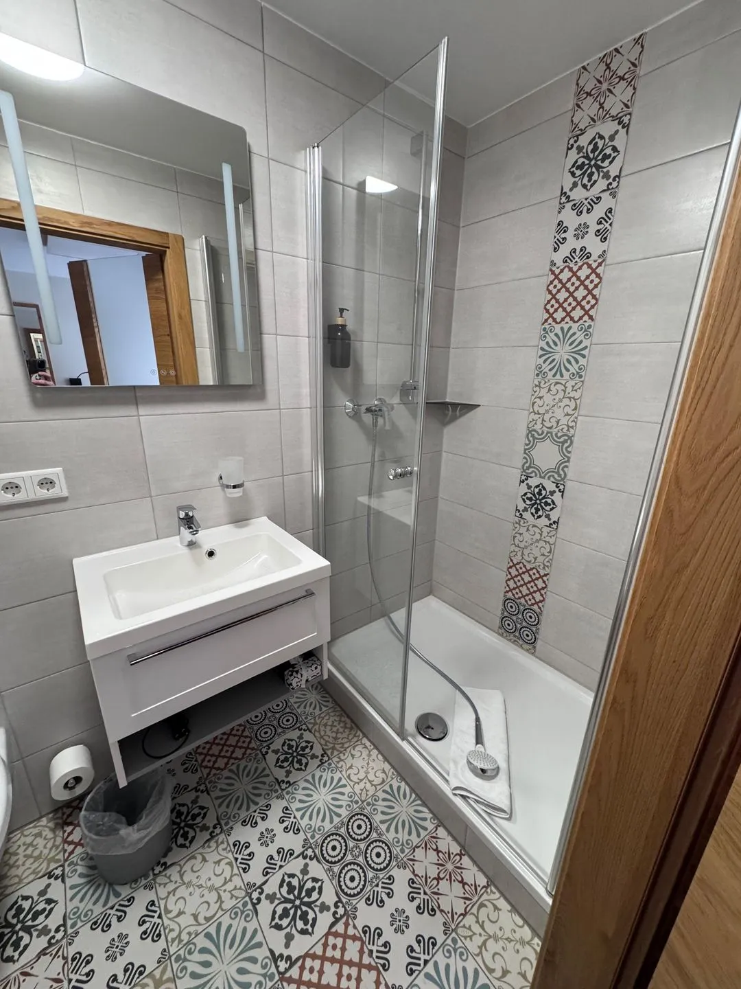 Das private Badezimmer umfasst eine Dusche mit Wanne, Waschbecken, WC, Haartrockner und bietet Ihnen stets warmes Wasser. Handtücher und Badetücher stehen für Sie bereit. Eine Garderobe rundet den funktionalen Eingangsbereich ab, während ein Ventilator auch in wärmeren Monaten für angenehmes Raumklima sorgt. Rauchmelder und Feuermelder sind zur Sicherheit in der Unterkunft installiert.