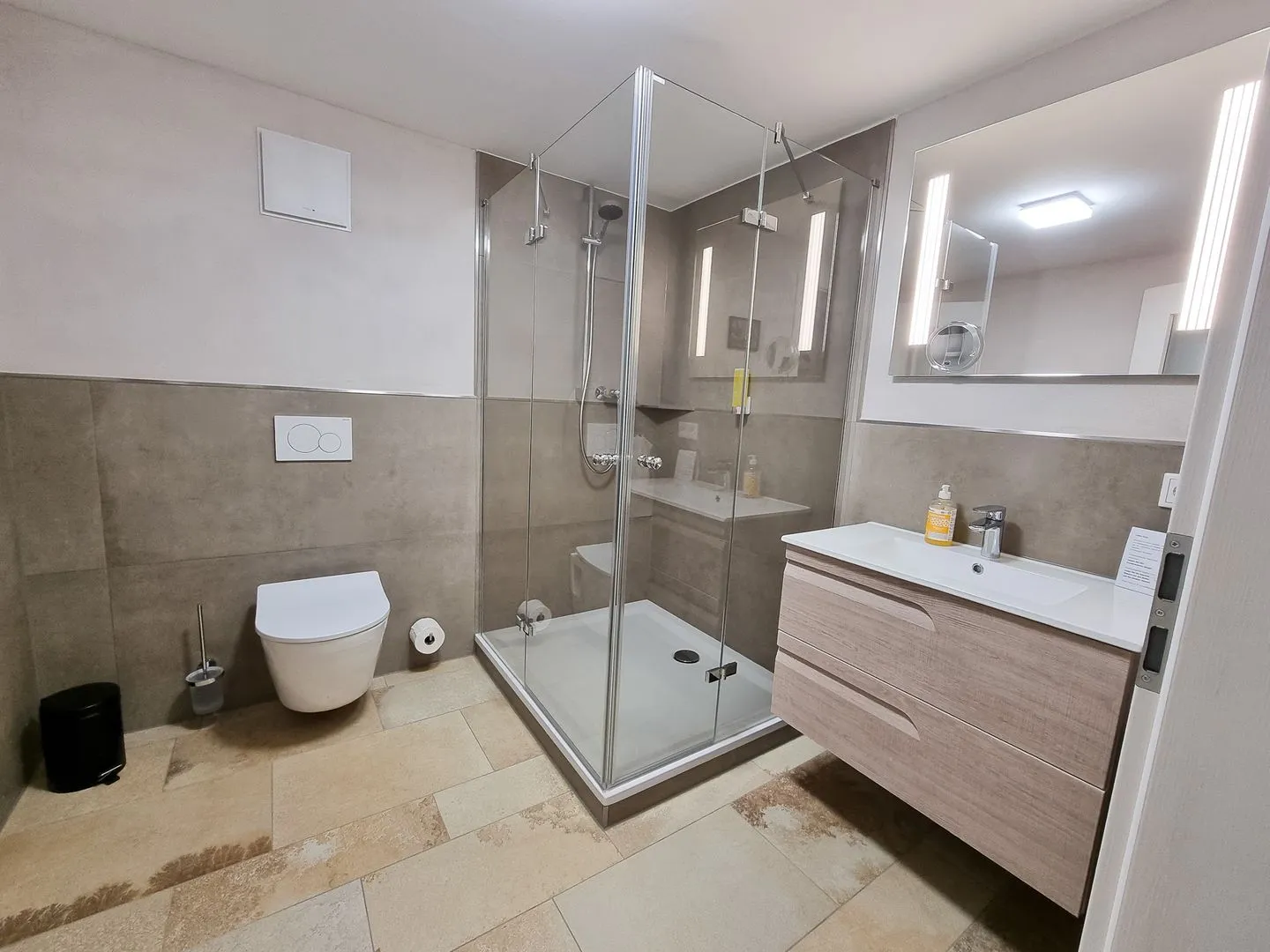 Badezimmer gefliest mit Feinsteinzeugfliesen in Juraoptik