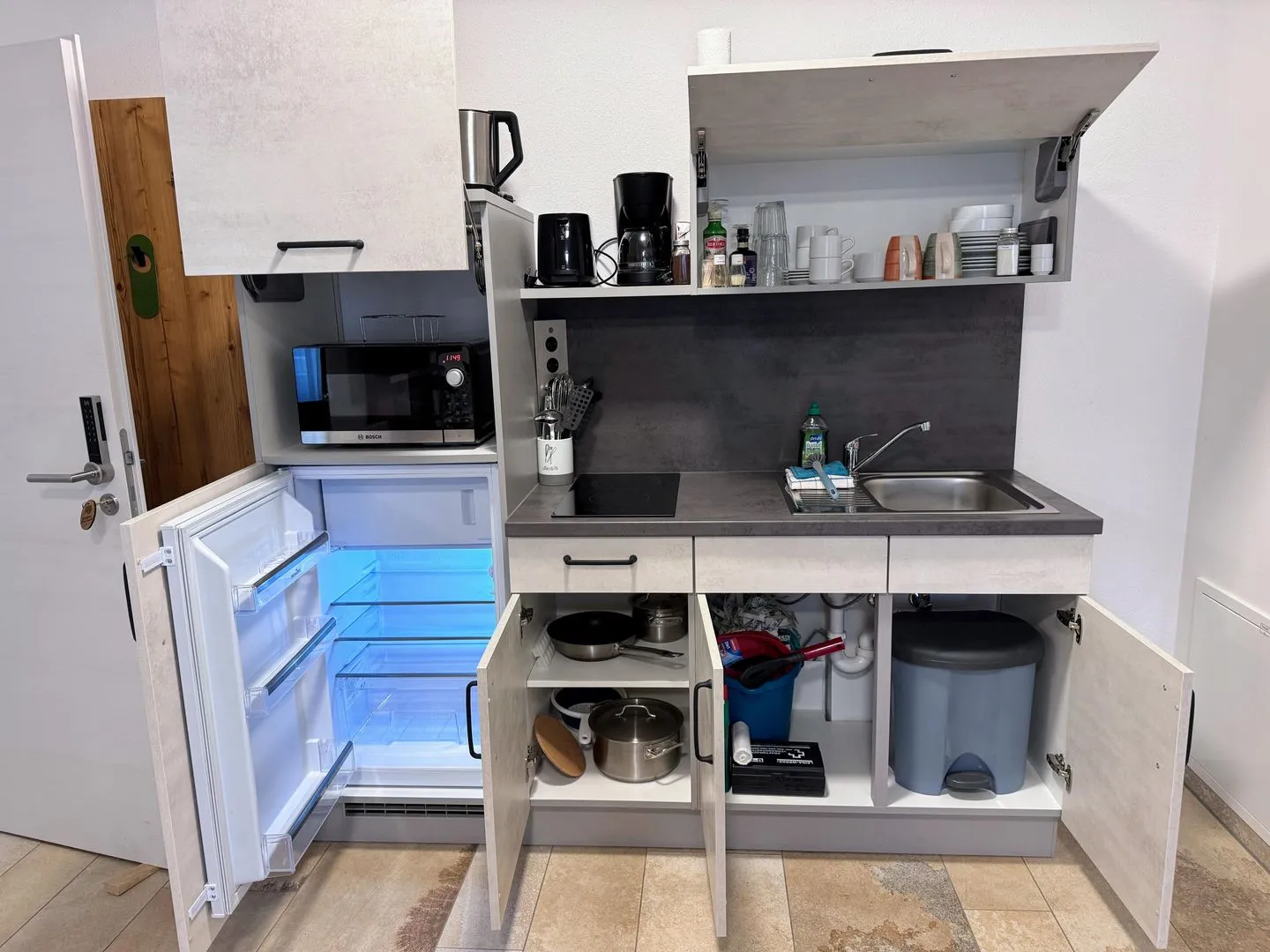 Voll ausgestattete Küchenzeile mit Kaffeemaschine (Filterkaffee), Toaster, Microwelle mit Backfunktion, Kochfeld mit 2 Induktionsfeldern
