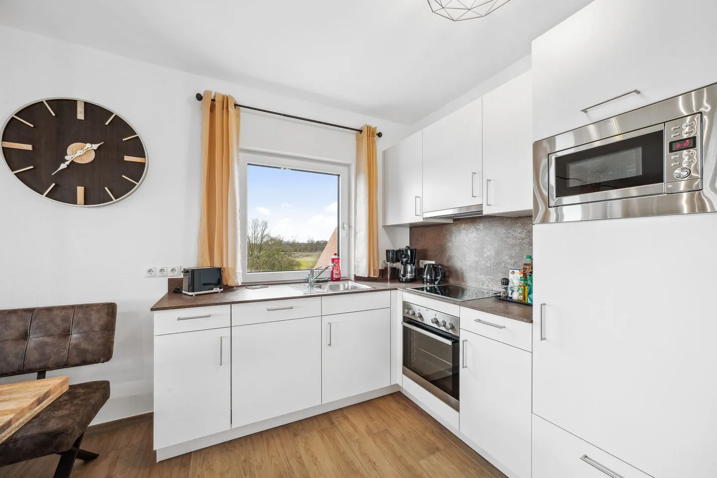 Voll ausgestattete Küchenzeile mit Kaffeemaschine (Filterkaffee), Toaster, Microwelle mit Backfunktion, Kochfeld mit 2 Induktionsfeldern